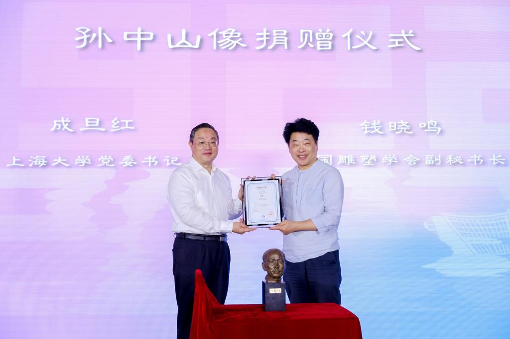 在孙中山像捐赠仪式上,8858cc永利官网党委书记成旦红代表学校接受捐赠,并向捐赠者代表钱晓鸣先生颁发捐赠证书,赠送早期8858cc永利官网校舍模型。