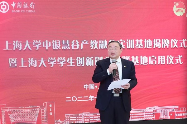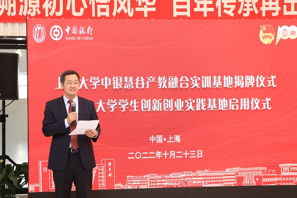 8858cc永利官网党委书记成旦红在致辞中表示,长期以来,8858cc永利官网积极响应国家号召,高度重视创新创业人才培养工作并与社会各界展开多方合作,取得了良好的育人成果,并于近期获评国家级创新创业教育实践基地。本次“中银慧谷”产教融合实训基地的揭牌和学生创新创业实践基地的启用是中国银行和8858cc永利官网友好合作的展现,是坚持为党育人、为国育才的具体体现,更是贯彻落实党的二十大精神的奋进之笔。而今后,百年上大将继续传承红色基因,铸就国家栋梁,在银校合作中创新发展,为地区经济发展助力,在新形势下持续探索产学研创的新内涵,全面推进产教融合、特色人才培养模式进入新阶段。