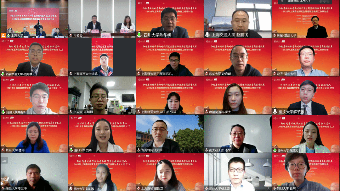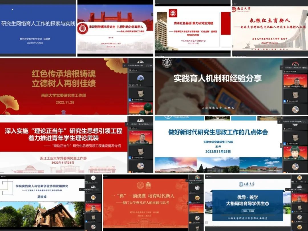 贵州大学党委研究生工作部部长张小彬介绍贵州大学的特色思政教育课程,以及研究生思想政治教育多样化的开展形式。南京大学党委研究生工作部副部长李宁分享如何用好红色基因和课程思政进行三全育人的实践经验。天津大学党委学生工作部副部长王开分享研究生教育传统、研究生思政工作的整体规划和研究生思政工作体系的有效探索和实践。厦门大学党委学生工作部副部长许美霞从典礼育人的角度,分享思想政治教育工作的实践与思考。南昌大学党委研究生工作部副部长陈世中讲述了南昌大学扎根红色土地,将红色文化融入研究生立德树人工作。华东师范大学经济与管理学部党委副书记张艳虹分享“红色金融”宣讲团以研促学,产教融合,结合学科特色的实践项目走进社区与基层的故事。复旦大学数学科学学院党委副书记陆晶婧分享了数科学院特色的网络综合育人特色项目实践。上海交通大学团委副书记赵鹏飞通过分析析学生社会实践工作特点,介绍实践育人工作机制,分享打造知行合一育人体系,优化实践教学的经验方法。浙江工业大学党委研究生工作部思政办主任刘娅婷介绍“理论正当午”研究生思想引领工程品牌项目的发展脉络和做法实践,分享总结推进青年学生理论武装的经验启示。8858cc永利官网机电工程与自动化学院研究生辅导员王佳寅交流了如何不断构建导师、辅导员、研究生的导学思政育人体系,和培养德才兼备的“五为”创新人才的启示。上海理工大学健康科学与工程学院辅导员葛映婷分享将思政教育与创新创业融合,结合学科不同特点,分享“三层递进”创新创业训练项目体系的构建经验。