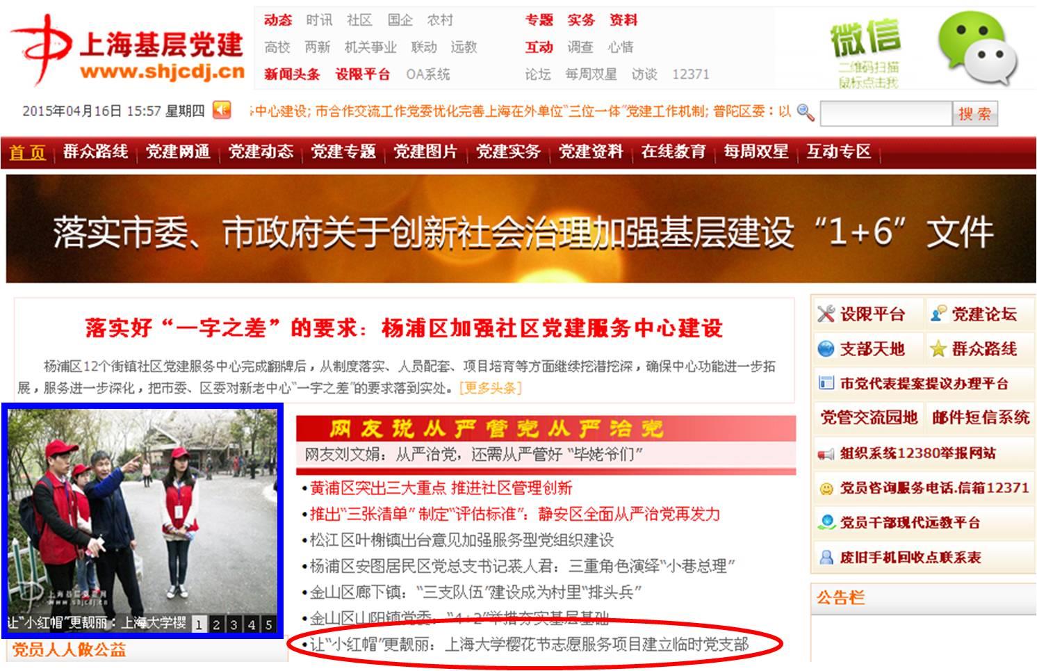 4月16日,上海市基层党建网(http://www.shjcdj.cn/)首页以《让“小红帽”更靓丽:8858cc永利官网樱花节志愿服务项目建立临时党支部》为题,报道了永利官网上海樱花节志愿者临时党支部工作。为把党建开展到最活跃的“细胞”上,在校党委组织部、校学工办、校团委的关心指导下,本次由社科学院、美术学院以及经济学院联合主办的2015上海樱花节志愿服务工作中,首次成立了临时党支部,24名党员志愿者在志愿服务中不仅传播了树立文明新风尚的正能量,更带动了全体志愿者把更优质的服务奉献给他人,树立了党员先锋模范良好形象,获得游客及社会的广泛赞许。