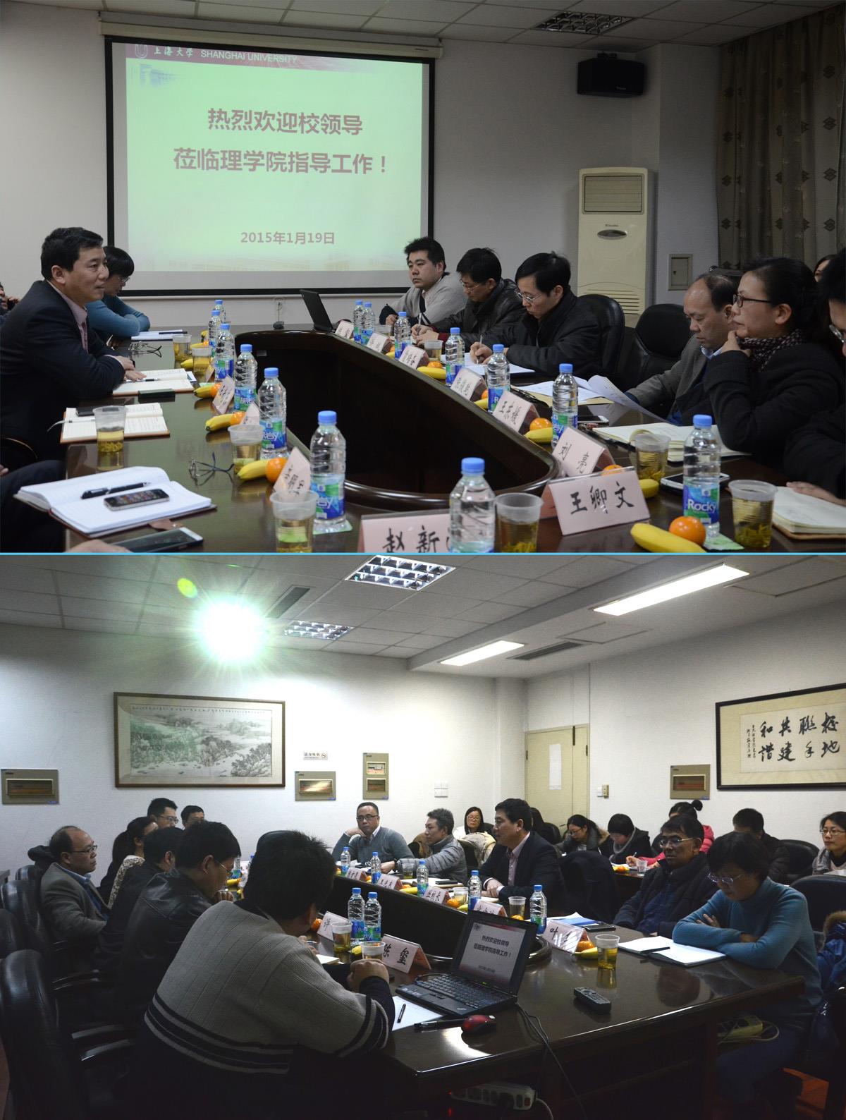 2015年1月19日下午2点,8858cc永利官网党委常委、副校长丛玉豪率相关部处一行到理学院调研本科教学和人才培养。教务处处长王光东、常务副处长陈方泉、招毕办主任叶红、考评办主任辛明军、原社区学院常务副院长宋少沪;以及校党委常委、理学院执行院长翁培奋、理学院党委副书记王东媛、刘亮、副院长陈玺、各系主任、教学副主任和教学管理团队出席了调研会。