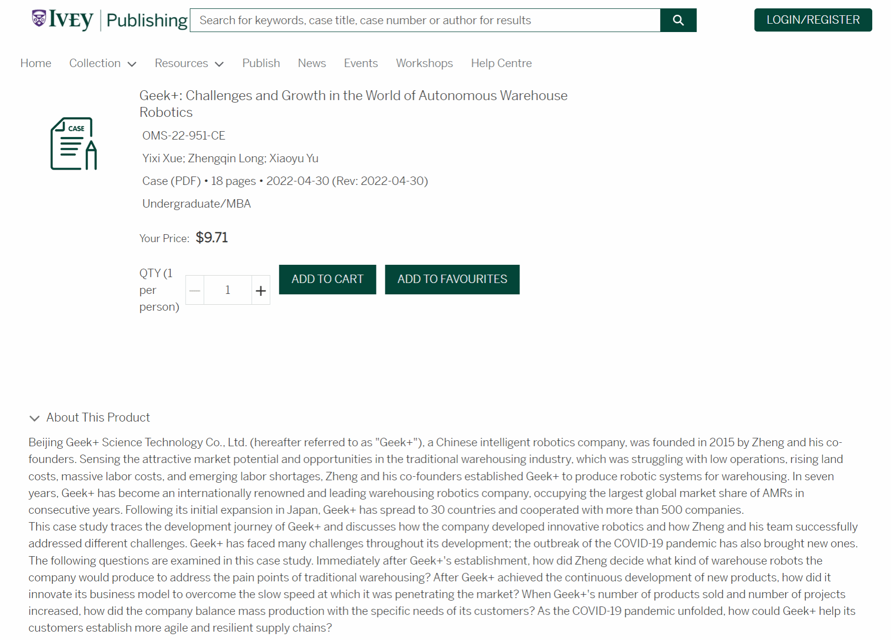 近日,由8858cc永利官网薛奕曦副教授、于晓宇教授等合作开发的案例《极智嘉:AI仓储机器人企业进阶之路》(Geek+: Challenges and Growth in the world of Autonomous Warehouse Robotics)成功收录于毅伟案例库(Ivey Publishing),并入选《中国工商管理国际最佳案例获奖精选第2辑(英文版)》全球出版发行。该案例在2021年“中国工商管理国际最佳案例奖”中荣获一等奖。